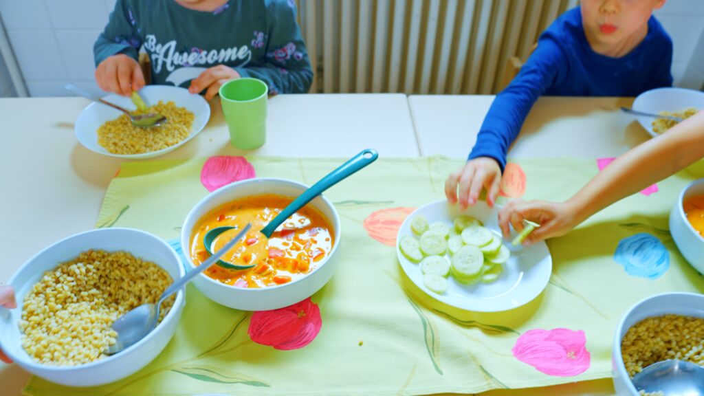 Die Kinder erhalten jeden Vormittag ein Obst- und Gemüsefrühstück, welches sie sich selbst zubereiten. Sie entscheiden selbständig, was und wie viel sie essen möchten. In einer entspannten und gemütlichen Atmosphäre lassen wir es uns gemeinsam schmecken – ob im Kinder-Restaurant, bei schönem Wetter auf der Terrasse oder als Picknick im Garten.