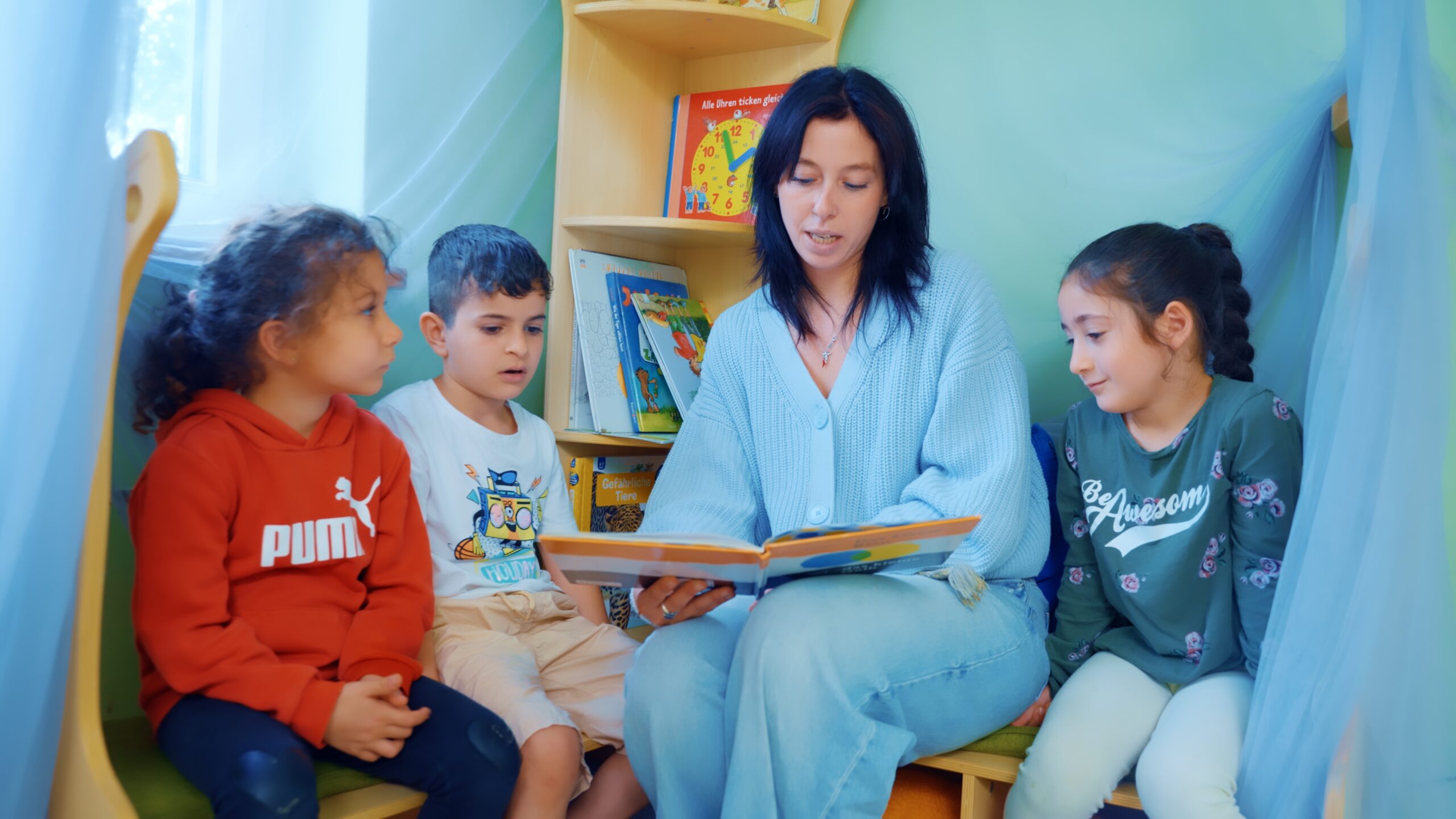 Mit dem Sprachförderprogramm ErzählZeit öffnet eine professionelle Erzählerin die Tür zu einer Welt voller Geschichten – Ihr Kind lauscht, träumt, lacht und entdeckt die Freude am eigenen Erzählen.